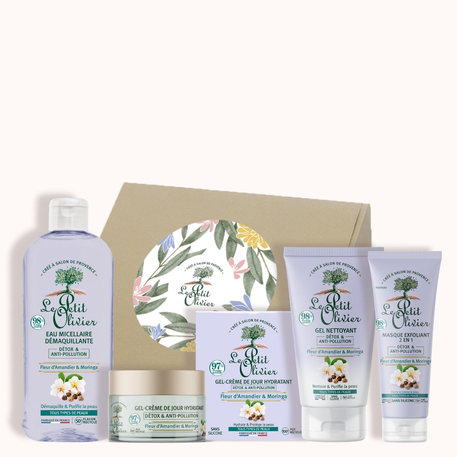 Découvrez notre gamme de soin visage Détox et anti-pollution Le Petit Olivier pour purifier et protéger votre peau des particules de pollution. Adaptée à tous types de peau, Cette gamme purificatrice et protectrice est composée d’une eau micellaire démaquillante, un gel nettoyant, un masque visage exfoliant et un gel-crème hydratant détox