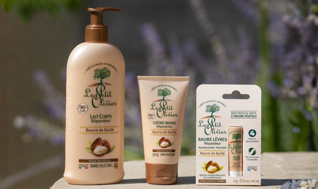 Le Rituel Soin Corps Le Petit Olivier rassemble trois soins au Beurre de Karité pour les peaux très sèches : Lait Corps, Crème Mains et Baume Lèvres. Ce rituel nourrit, répare et hydrate intensément la peau.