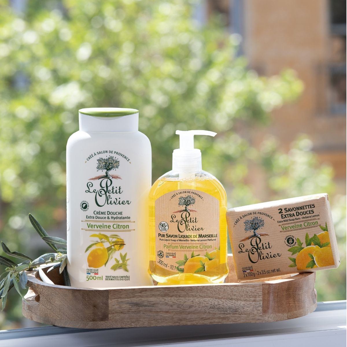 Le Petit Olivier vous invite à découvrir ce Trio Vivifiant composé d’une Crème de Douche, de 2 Savonnettes Extra Douces et d’un Pur Savon Liquide de Marseille, tous au parfum frais et tonique Verveine Citron. Cette routine complète nettoie la peau tout en la parfumant délicatement.