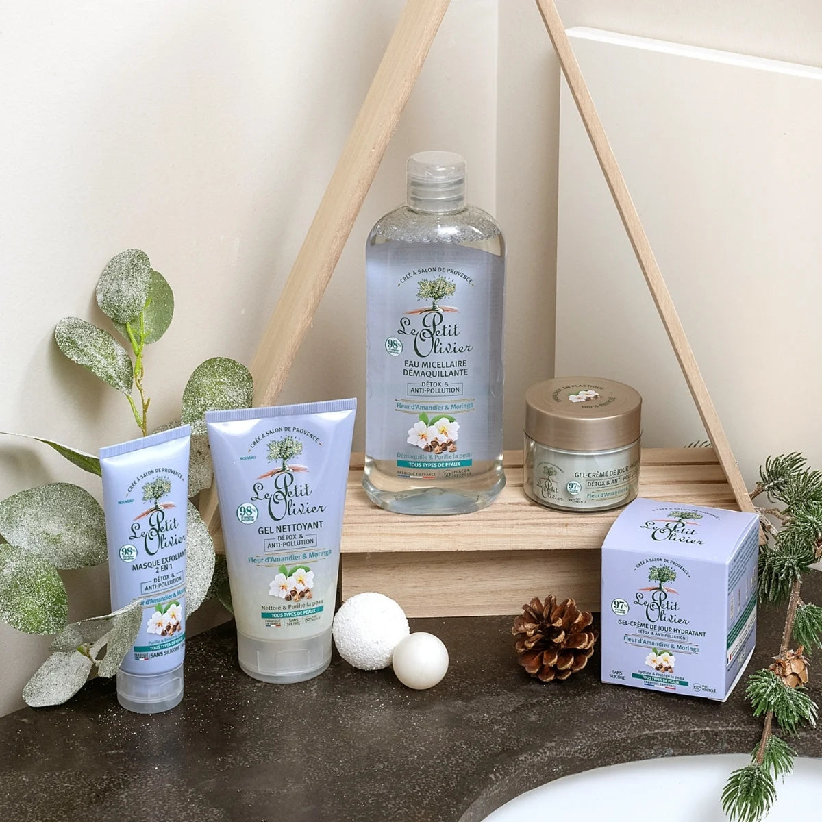 Le Coffret Soin Visage Détox & Anti-Pollution Le Petit Olivier réunit quatre soins essentiels à la Fleur d’Amandier & au Moringa pour purifier, hydrater et protéger la peau des particules de pollution.