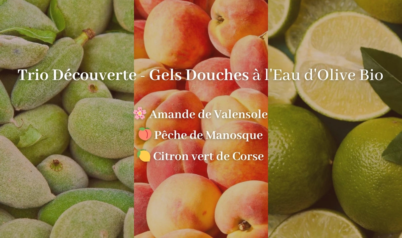 Le Trio Découverte Gels Douches Le Petit Olivier réunit trois parfums emblématiques à l’Eau d’Olive Bio : Citron Vert de Corse, Pêche de Manosque et Amande de Valensole. Leur mousse onctueuse nettoie la peau tout en laissant un parfum frais et fruité.