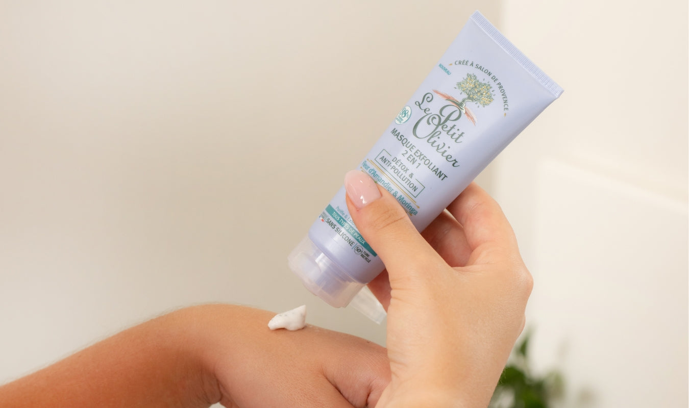 Le Masque Exfoliant 2 en 1 Le Petit Olivier allie exfoliation douce et action détoxifiante. Sa formule aux extraits de Fleur d’Amandier et de Moringa désincruste les pores, affine le grain de peau et protège des agressions extérieures pour une peau fraîche et lumineuse.