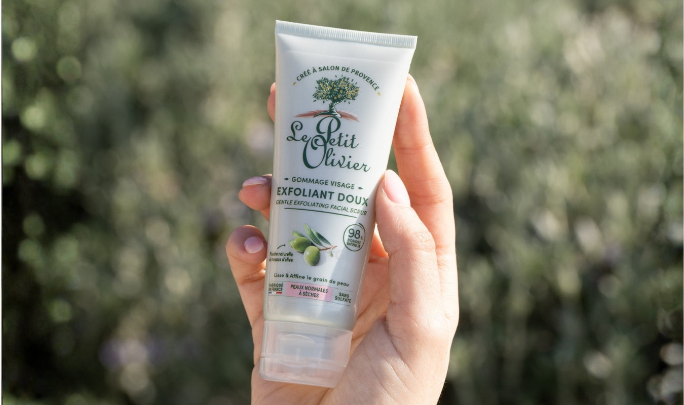 Le Gommage Visage Exfoliant Doux Le Petit Olivier lisse et affine le grain de peau tout en respectant les peaux normales à sèches. Sa formule sans sulfate à base de poudre de noyaux d’olive exfolie en douceur pour une peau lisse et un teint lumineux.