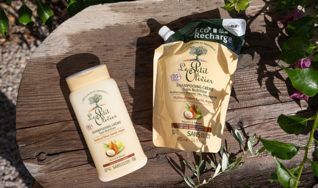 Le Duo Shampooing Crème Soin Nutrition & Recharge Le Petit Olivier associe un shampooing 250ml et sa recharge 500ml aux Huiles d’Olive, Karité et Argan. Il nourrit et répare les cheveux secs et abîmés tout en réduisant les emballages.